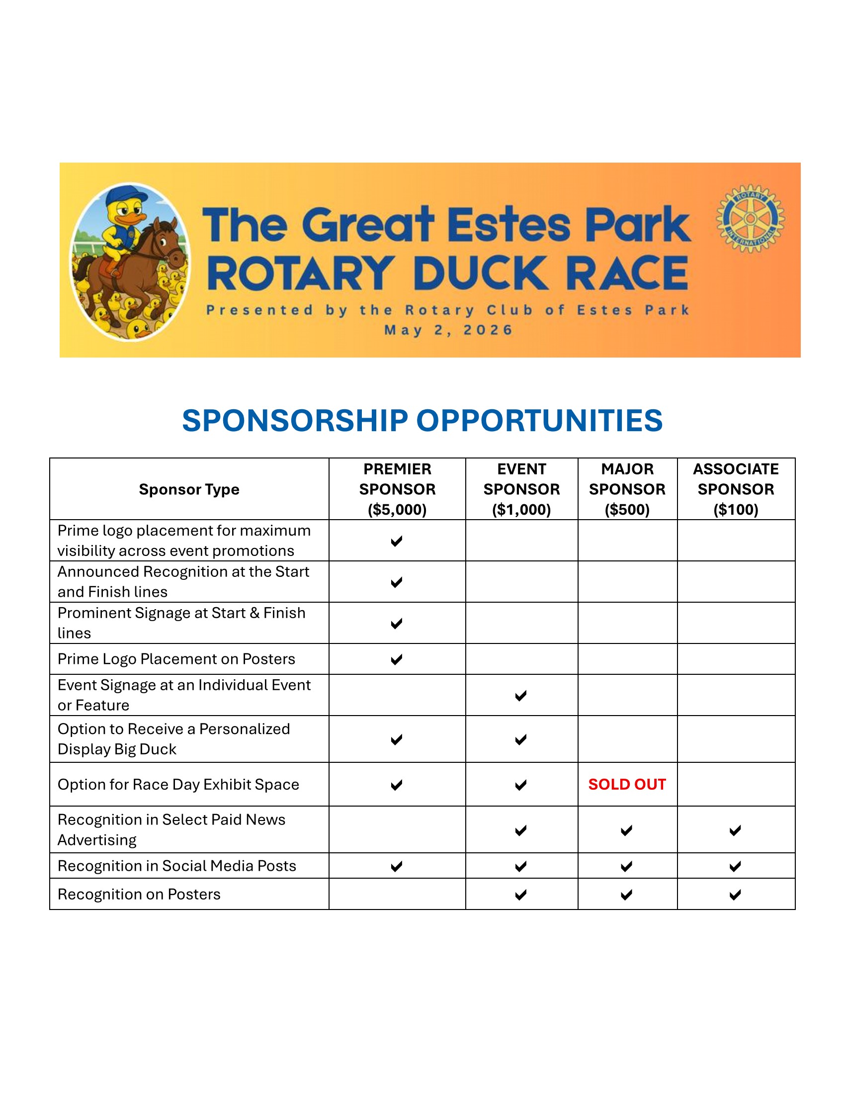 For 2026, The Great Estes Park Rotary Duck Race is offering several sponsorship opportunities: Associate Sponsor ($100+)Offered to anyone who wishes to support the work of
